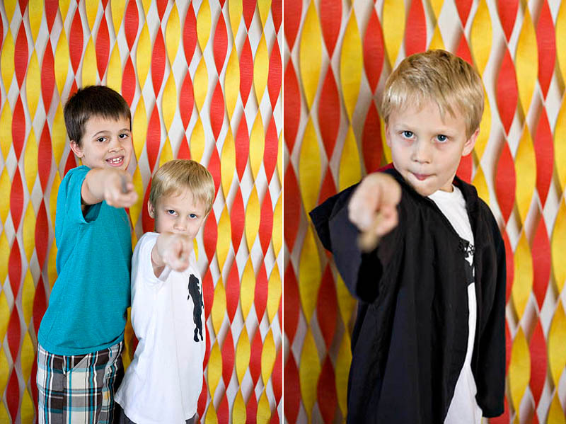 -un arrière-plan : il peut être neutre ou thématique mais il doit être bien choisi (esthétique et facile d'accès) car vos invités vont poser devant ; cela peut être devant des rideaux fermés, devant un mur normal nu, ou bien décoré de guirlandes (cf l'exemple avec les serpentins de crépon aux couleurs de Gryffondor) ou encore masqué d'un tissu à motifs ou préalablement peint selon le thème (mur de la plateforme 9 3/4 par exemple) ect.Veillez à ce que la lumière soit correcte à cet endroit là pour avoir de belles photos.